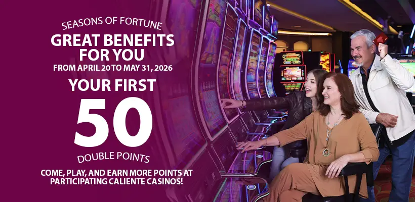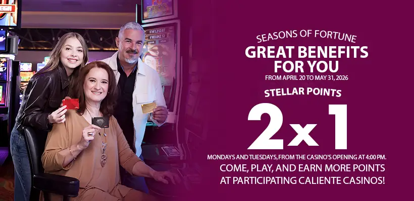 Come to Caliente Casino from April 20 to May 31, play on your favorite machines, and for every Star Point you accumulate, you will receive an extra one (valid up to your first 50 points).